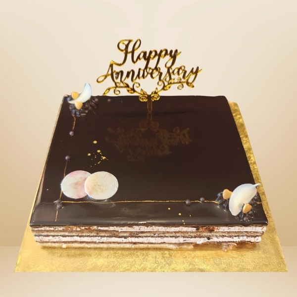 Opera cake (French: Gâteau opéra) is a French cake. It is made with layers of almond sponge cake (known as Joconde in French) soaked in coffee syrup, layered with ganache and coffee (or Grand Marnier) French buttercream, and covered in a chocolate glaze.